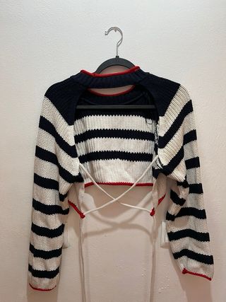 Preciosa blusa de crochet con diseño de rayas, ideal para un look casual. - Diseño cropped. - Detalle de tiras cruzadas en la espalda. - Acabado con ribete rojo en cuello y bajo.