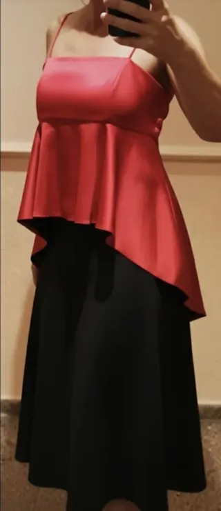 Este top es ideal para ocasiones especiales, cenas o una salida de noche. Tiene un acabado brillante tipo satén que le da un aire muy elegante y sofisticado. Diseño: Escote recto con tirantes finos (spaghetti straps). Corte tipo peplum que favorece mucho la silueta, siendo más corto por delante y con una caída más larga y fluida por detrás (cola asimétrica). Color: Rojo vibrante/satinado.