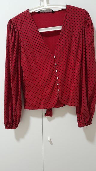 Blusa roja de lunares negros. Lazo en la espalda que sienta estupendo. Lleva un botón de repuesto.