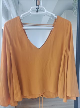 Blusa escote en V pronunciado en pecho y espalda con detalle de cuerdas en la parte de atrás. Esta como nuevo, casi sin usar, talla M de TRF, Zara