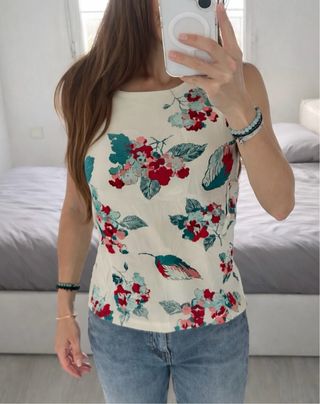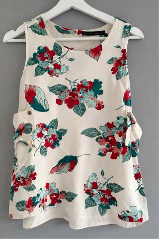 Blusa de Zara con un estampado floral vibrante. Perfecta para un look casual y fresco. - Diseño sin mangas. - Cuello redondo. - Estampado de flores en tonos rojos, azules y verdes.