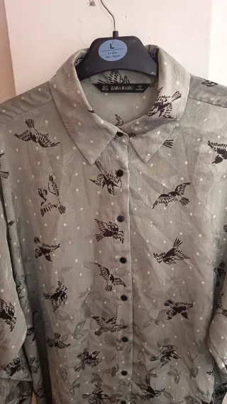 Camisa de Zara, abierta hasta medio pecho, con bolsillos caídos, de tela fluida y con tonos satinados. Color verde caqui oscuro, la foto que mejor lo refleja es la de la manga. Talla S pero queda holgada, talla más M (tengo una 90D de pecho y me queda perfecta, no tirante).