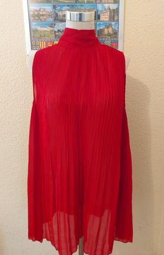 Preciosa blusa de Zara en color rojo. Es una prenda elegante y versátil, ideal para cualquier ocasión. - Talla L / 40 / 12 - Diseño de doble capa - Escote en pico - Sin mangas