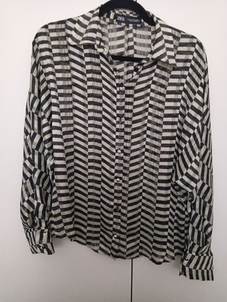 Blusa de Zara con un diseño elegante y moderno. - Estampado en blanco y negro. - Detalle de volantes en cuello y mangas. - Tejido ligero y vaporoso. Temporada 2024/25