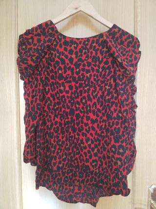 Blusa de manga abullonadas. Tejido estampado animal print / leopardo en tonos rojos. Zara. Talla XS