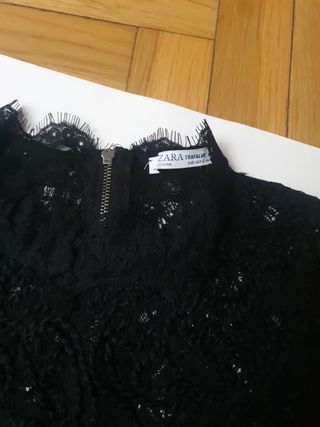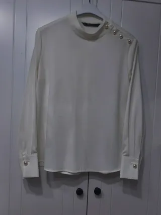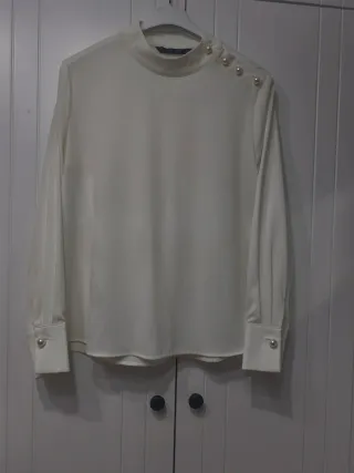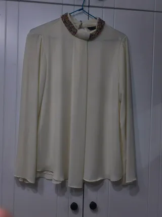 Elegante blusa de Zara con un detalle de pedrería en el cuello. - Cuello redondo con adornos. - Manga larga. - Tejido ligero.