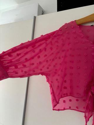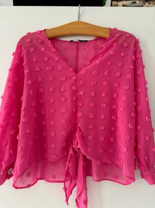Blusa o top de lunares de Zara. Manga corta. Tela con mucha caída. Detalle del cuello.