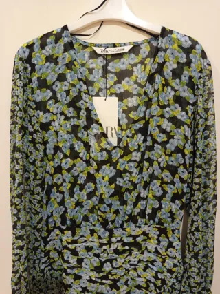 Vestido corto estampado de flores. - Manga larga, puño con botones. - Escote en pico. De gasa, semitransparente la parte de arriba. La parte de arriba es tipo blusa, más amplia. La parte de abajo drapeada, queda ajustada. La parte de abajo, lleva forro interior desde la cintura. Bajo del vestido con un pequeño volante. De Zara, talla S. Talla algo más pequeño de lo habitual, más ajustado en la parte de abajo, cadera. NUEVO, con etiqueta.