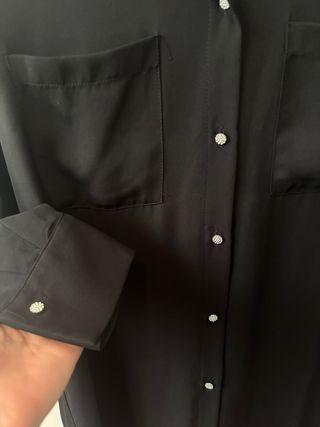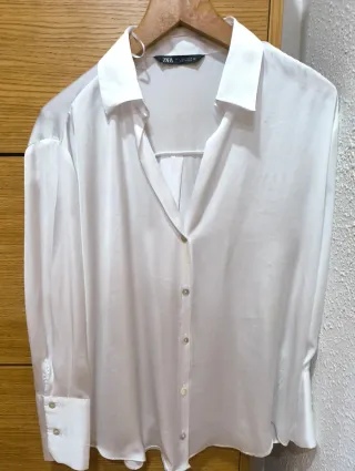 Elegante blusa de Zara con un diseño clásico y sofisticado. - Confeccionada en tejido ligero y fluido. - Cuello camisero. - Cierre de botones joya en frente y puños. - Dos bolsillos en la parte delantera. Parte superior trasera y media de las mangas transparente. El frente y la media trasera no transparenta nada Nueva