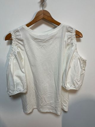 Blusa blanca con un diseño moderno y fresco. - Mangas abullonadas con detalle fruncido. - Corte de hombros descubiertos. - Tejido suave y cómodo.