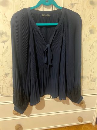 Preciosa blusa plisada de color azul marino. Es de manga larga con detalles de encaje en negro en los puños. Tiene un bonito lazo en el cuello. Está en perfecto estado. - Plisada - Manga larga - Cuello con lazo - Detalles de encaje en puños