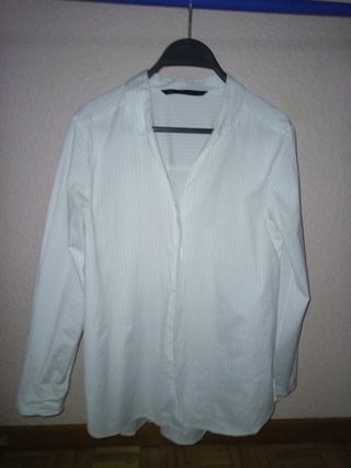 Preciosa blusa blanca de Zara, de corte asimétrico. Es una prenda elegante y cómoda, ideal para cualquier ocasión. Elástica - Talla L aprox - Manga larga - Cuello camisero - Tejido ligero