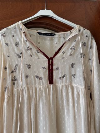 Elegante blusa de Zara, perfecta para ocasiones especiales. Su diseño con detalles brillantes la hace destacar. - Tejido ligero y vaporoso. - Escote con cordones - Mangas largas con botones muy bonitos - Bajo con Cordones ajustables