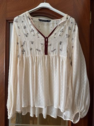 Blusa ancha de Zara con un diseño moderno y favorecedor. - Tejido ligero y vaporoso. - Mangas abullonadas. - Detalle de lazada en el bajo.