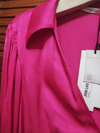 Elegante blusa de manga larga con un vibrante tono fucsia. - Diseño con cuello camisero. - Cierre de botones. - Tejido satinado con caída.