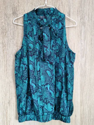 Blusa halter de tejido suave con estampado efecto serpiente en tonos azules-verdes. Corte fluido con lazada al cuello y goma inferior para un ajuste cómodo, talle pequeño. Perfecta para looks de fiesta o de oficina. Sin uso. Descuento por lote a partir de 2 artículos 💫 Envío rápido y con mimo 💌 Blanco, blusa, halter, estampada, turquesa, fiesta, camisa, noche, eventos, lazada