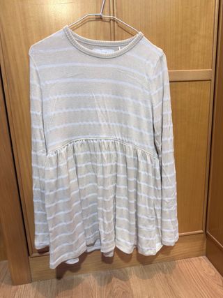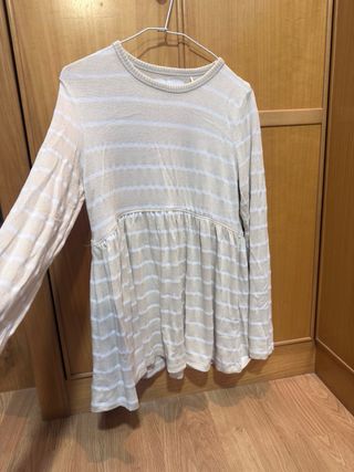 Blusa de manga larga con un diseño de rayas en tonos beige y blanco. Presenta un corte fruncido debajo del pecho que le da un estilo suelto y cómodo. - Diseño de rayas horizontales. - Manga larga. - Cuello redondo.