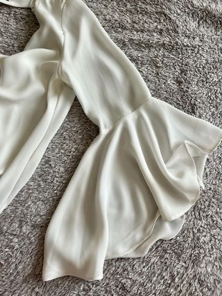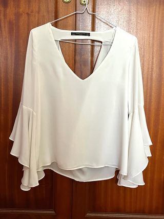 Elegante blusa blanca de Zara con un diseño moderno y sofisticado. - Mangas acampanadas con volantes. - Corte en V pronunciado en la parte delantera. - Abertura en forma de triángulo en la espalda. - Espalda desbocada.