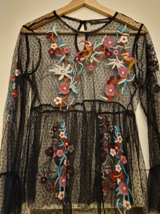 Blusa de Sfera con transparencias y bordados florales. -Vale para una Talla M - Diseño de manga larga. - Tejido de tul con pequeños puntos. - Detalle de bordados multicolores en delantero y mangas.