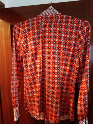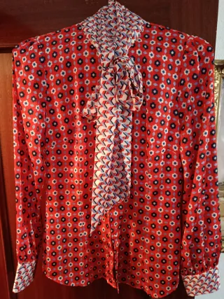 Elegante blusa de seda con un vibrante estampado. NO SÉ LA TALLA. Más o menos será la 46. Medidas de hombro a hombro 43 cm y de pecho 120 cm - Diseño con mangas largas negras. - Cuello mao. - Cierre de botones frontales TIENE LA FALDA A JUEGO SI SE QUIERE