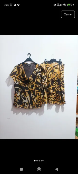 Conjunto de dos piezas para mujer con un llamativo estampado. - Blusa con cuello drapeado y manga corta. - Falda con volantes. - Diseño único y moderno.