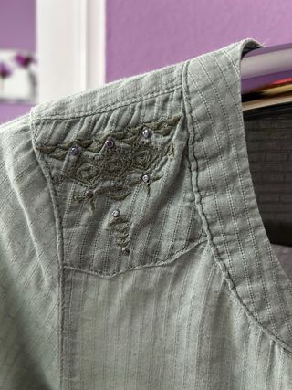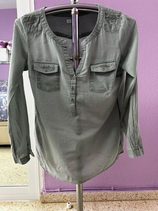 Blusa de manga larga con un diseño elegante y detalles bordados en los hombros y bolsillos. - Cuello redondo con abertura y botones. - Dos bolsillos en la parte delantera. - Tejido ligero con textura.
