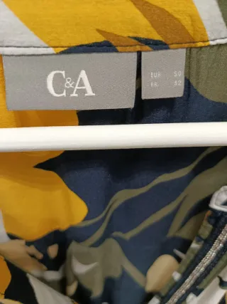 Blusa con estampado animal print de C&A. Punto suelto en manga imperceptible a simple vista (ver fotos 5,6 y 7). Venta solo por envio excepto si hemos tenido contactos satisfactorios podemos quedar. La talla según etiqueta es la 48. - Diseño con volantes en el escote. - Mangas largas. - Tejido ligero y transparente, con forro interno en el cuerpo.