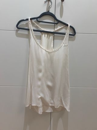 Blusa de tirantes estrechos, vaporosa, fluida y con vuelo de Stradivarius en talla S en blaco roto. Muy poco uso. Es elegante pero informar y parece como se seda aunque es poliéster por su caída. Detalle de cierre de botones en la espalda. No regateo.