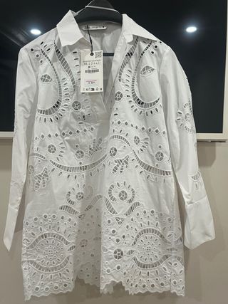 Blusa blanca con un diseño de bordados intrincados. - Cuello camisero. - Manga larga. - Detalle de calados. - Bajo con acabado festoneado.