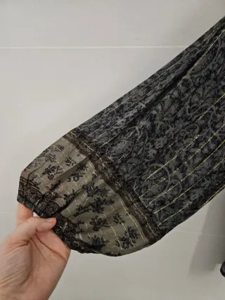 Blusa de Zara con un estilo boho chic. Axzul marino con adornos dorados. Abalorios dorados y estampado floral. Manga larga bombacha.