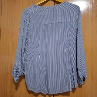 Blusa de entretiempo con un diseño de rayas verticales en blanco y azul. - Cuello en V. - Mangas 3/4 con detalle de lazada en los puños. - Bajo curvo.