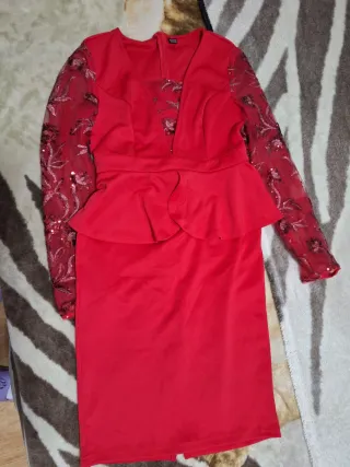 Elegante conjunto de blusa y falda en color rojo. - Blusa con mangas largas de tul bordado y lentejuelas. - Escote en V. - Peplum en la cintura. - Falda recta hasta la rodilla.