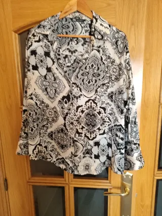 Camisa de manga larga con un llamativo estampado. Es muy amplia vale también para XL. - Diseño con motivos paisley. - Cuello camisero. - Cierre de botones.