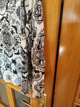Blusa de manga larga con un estampado geométrico en blanco y negro. Presenta un cuello redondo y un corte sutil. - Tela de calidad con muchas caída - Bolsillo en el delantero izquierdo - Abertura en los lados - Diseño de rombos en blanco y negro. - Manga larga con ribete - Ligeramente más corta por delante 69 CMS que por detrás 75 CMS.