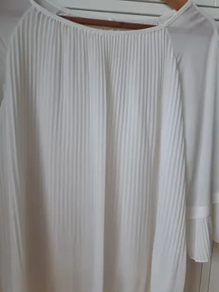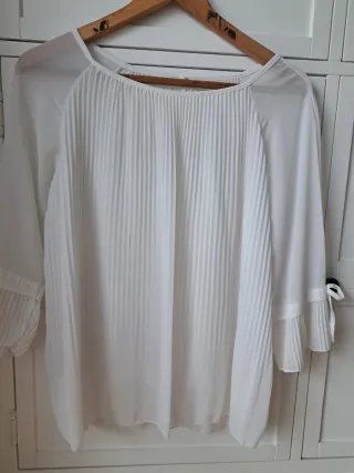 Elegante blusa blanca con detalle de plisado. - Manga 3/4 con puño y lazo. - Diseño plisado en el delantero y mangas. - Tejido ligero y vaporoso.
