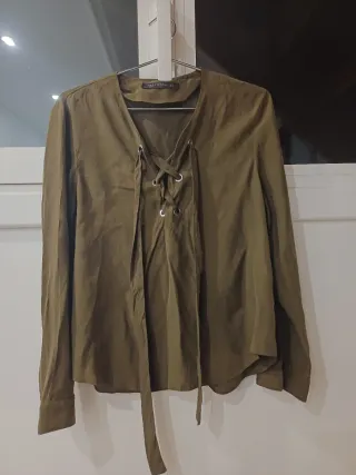Blusa de Zara con un diseño moderno y detalles únicos. - Color verde - Talla M (38/10) - Cierre de lazada con ojales metálicos - Cuello en V