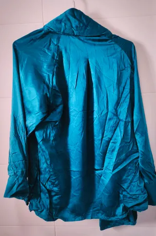Elegante camisa efecto satén. Perfecta para añadir un toque de sofisticación a cualquier atuendo. - Material: Satén - Diseño: Cuello camisero y botones frontales - Mangas: francesa con puños -Usada una vez