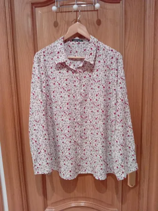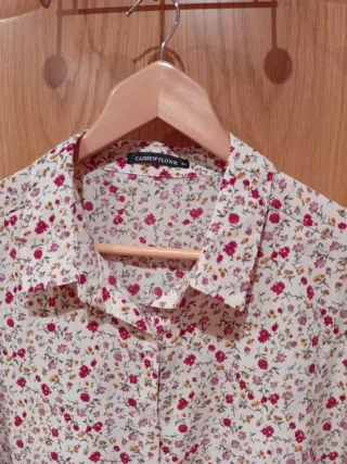 Camisa con un bonito estampado de florecillas en tonos ocre y blanco con detalles negros. Es una prenda ligera y versátil, para fondo de armario. - Cuello camisero. - Cierre de botones. - Bolsillo en el pecho. Casi nueva.