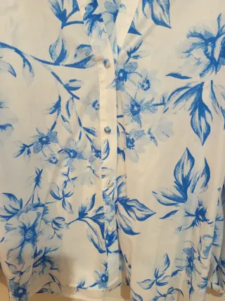 Blusa de algodón con un bonito estampado floral en tonos azules. - Diseño con cuello en V. - Mangas largas abullonadas, terminadas en puño estrecho con un botón. - Tejido ligero y fresco. - 4 botones forrados de la misma tela. Composición: 100% algodón. De Zara, talla XS. Medidas: 49 cm ancho (de sisa a sisa) 64 cm largo 57 cm manga (desde el hombro) Está como nueva.