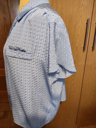 Blusa manga corta en color azul claro. Marca El Corte Inglés. 100% poliéster . Talla aproximada 50. Medidas: de sisa a sisa 65 centímetros; largo 65 centímetros. Perfecto estado.