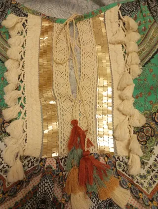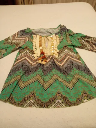 Blusa de estilo étnico con un diseño vibrante y detalles únicos. - Estampado geométrico y floral. - Cuello con cordones y detalle de flecos. - Adornos de lentejuelas y pompones. - Mangas largas.