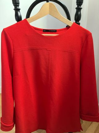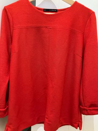Cuerpo de color rojo tomate, cuello redondo, de manga francesa con puño vuelto y remache dorado. - Tejido con textura. - Cuello redondo. - sin botones ni cremallera . - Puños vueltos.