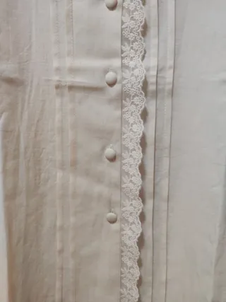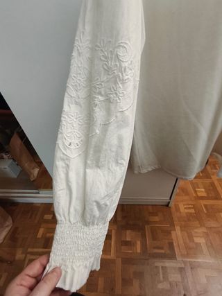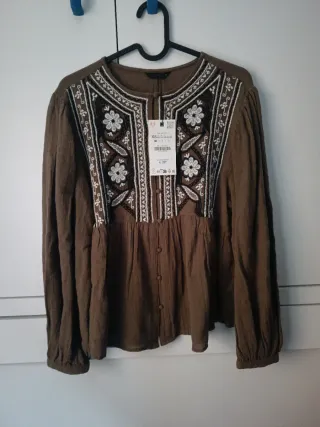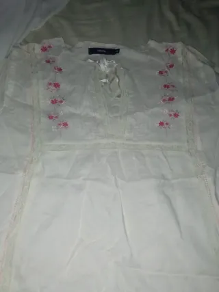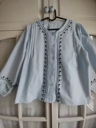 Blusa de manga larga con un bonito bordado frontal. Talla XS amplia - Diseño con cuello redondo. - Cierre de botones en la parte delantera. - Mangas abullonadas con puños. Se envía o entrega en Madrid.
