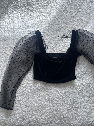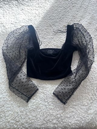 Elegante blusa de Bershka con mangas abullonadas. - Tejido principal de terciopelo. - Mangas transparentes con estampado de topos. - Escote cuadrado.