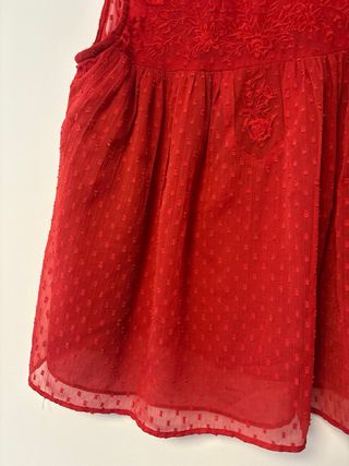 Blusa sin mangas de Zara con un bonito bordado floral en la parte superior y un delicado estampado de topos en toda la prenda. - Diseño sin mangas. - Escote redondo. - Cierre de botones en el hombro. - Tejido ligero y vaporoso.