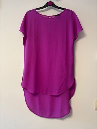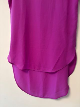 Blusa elegante de color fucsia con un diseño cruzado y fruncido en la cintura. Cremallera lateral. Sisa 44. Cintura 40. Largo 66 Puesto un par de veces. - Diseño sin mangas. - Tejido ligero y fluido.