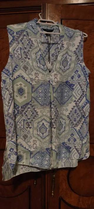 Blusa sin mangas con un bonito estampado geométrico en tonos azules y verdes. Es una prenda nueva, ideal para añadir un toque de estilo a tu armario. - Diseño sin mangas. - Estampado geométrico. - Prenda a estrenar. talla M amplia