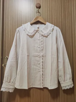 Elegante blusa clásica de manga larga. - Confeccionada en 100% algodón. - Cuello redondo con detalle de encaje. - Cierre de botones. - Puños y detalles de encaje en la parte frontal.