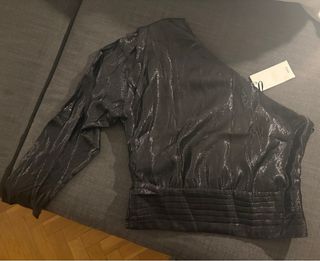 Elegante blusa asimétrica con un diseño moderno. - Manga larga abullonada en un lado. - Tejido con brillo sutil. - Detalle de fruncido en la cintura.