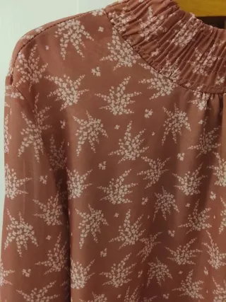 Blusa elegante con un estampado floral en tonos rosados. - Cuello alto con fruncido. - Mangas largas con puños fruncidos. - Tejido ligero y vaporoso.